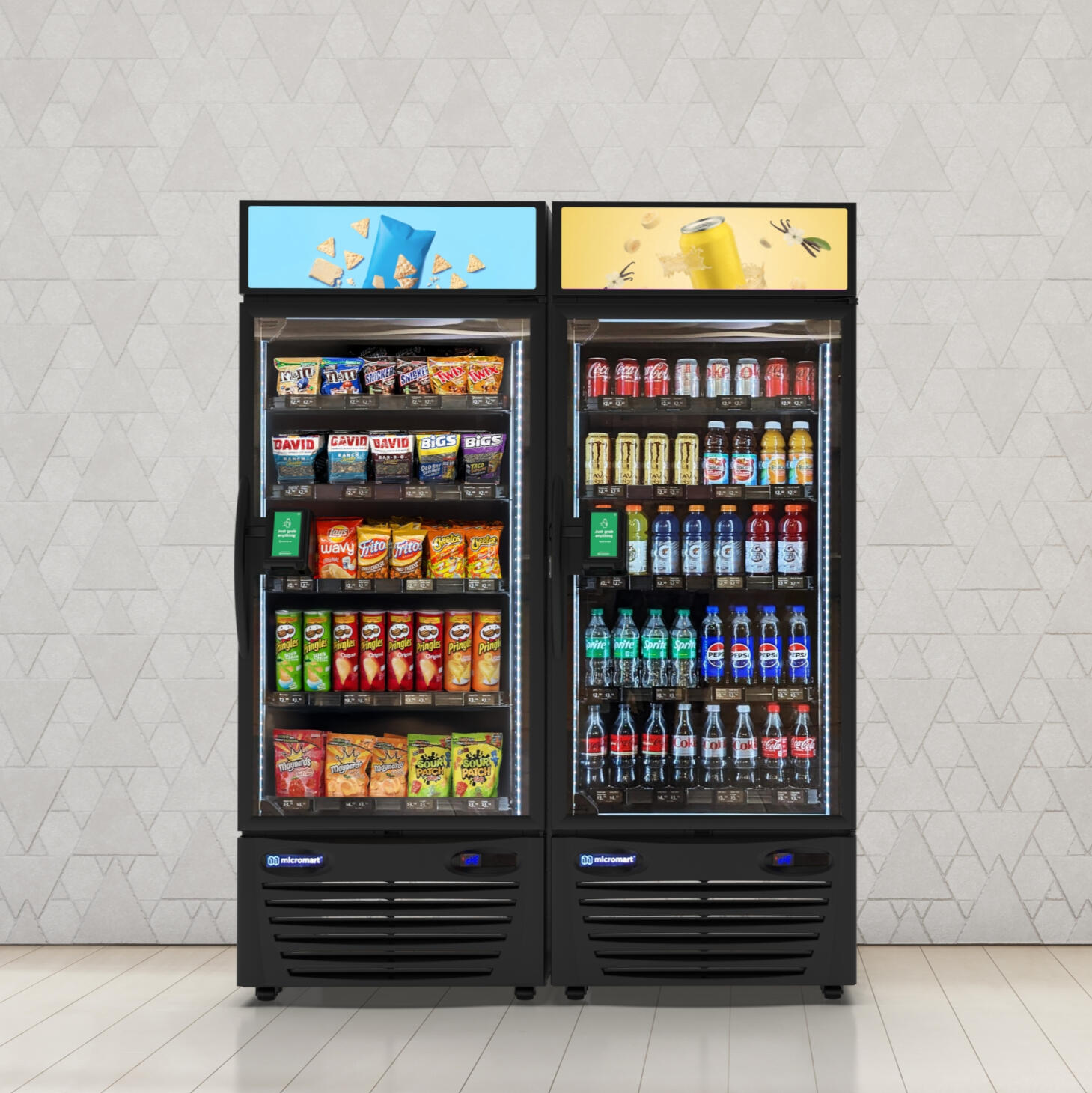 Our smart-fridge machines are packed with technology, allowing you to simply open the door - grab as many items as you'd like - and close the door. We will handle the rest! Here is a quick breakdown:1. Unlock with any Credit Card, Digital Wallet, Apple Pay, etc.